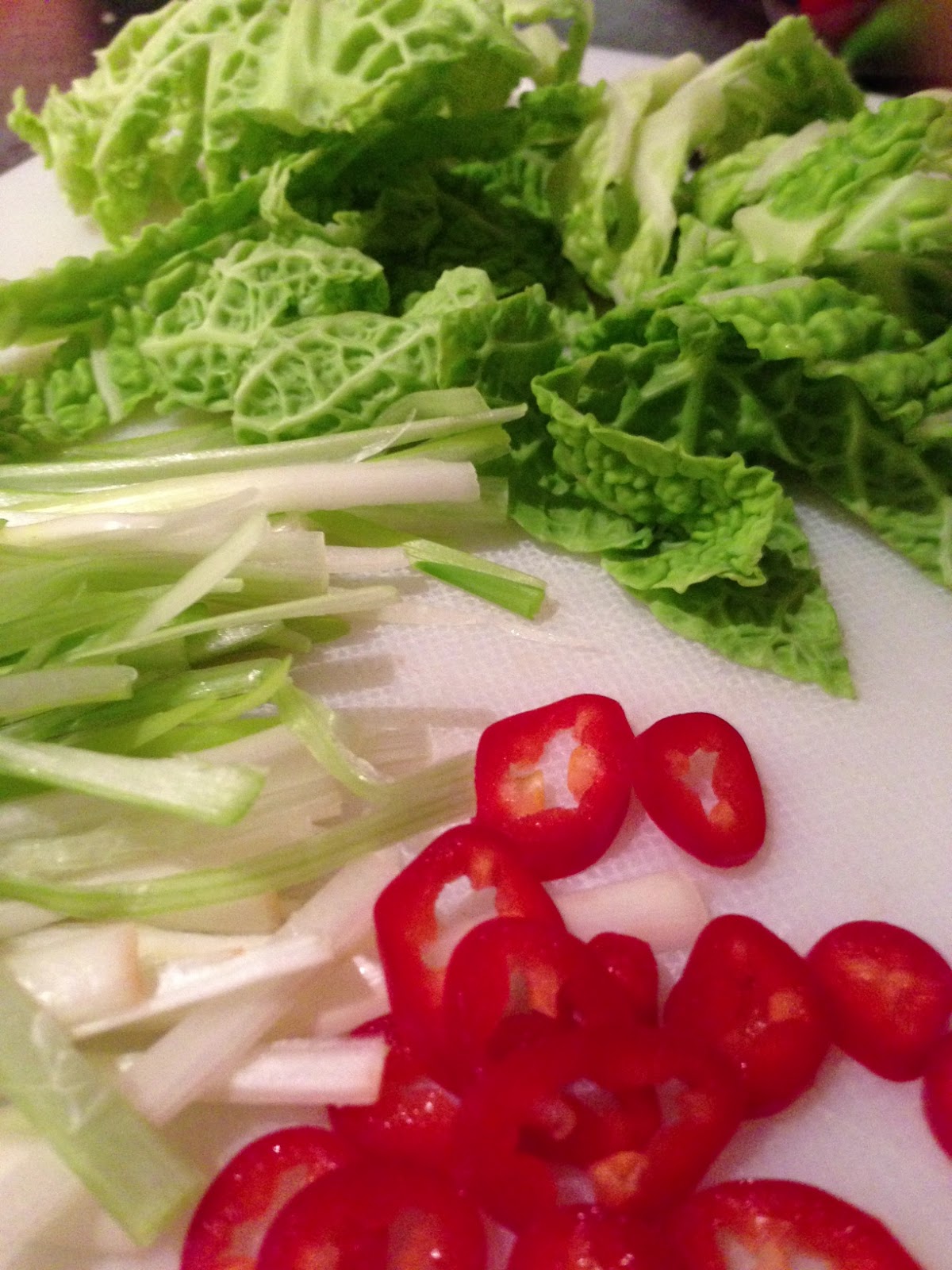 3. In the same pan, turn up the heat and add the remaining oil, cabbage, most of the chilli, ginger, garlic and spring onions that were cut lengthways, fry for 3-5 minutes.